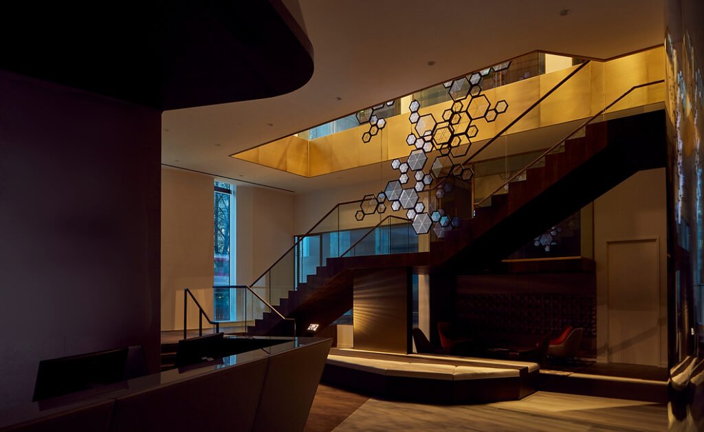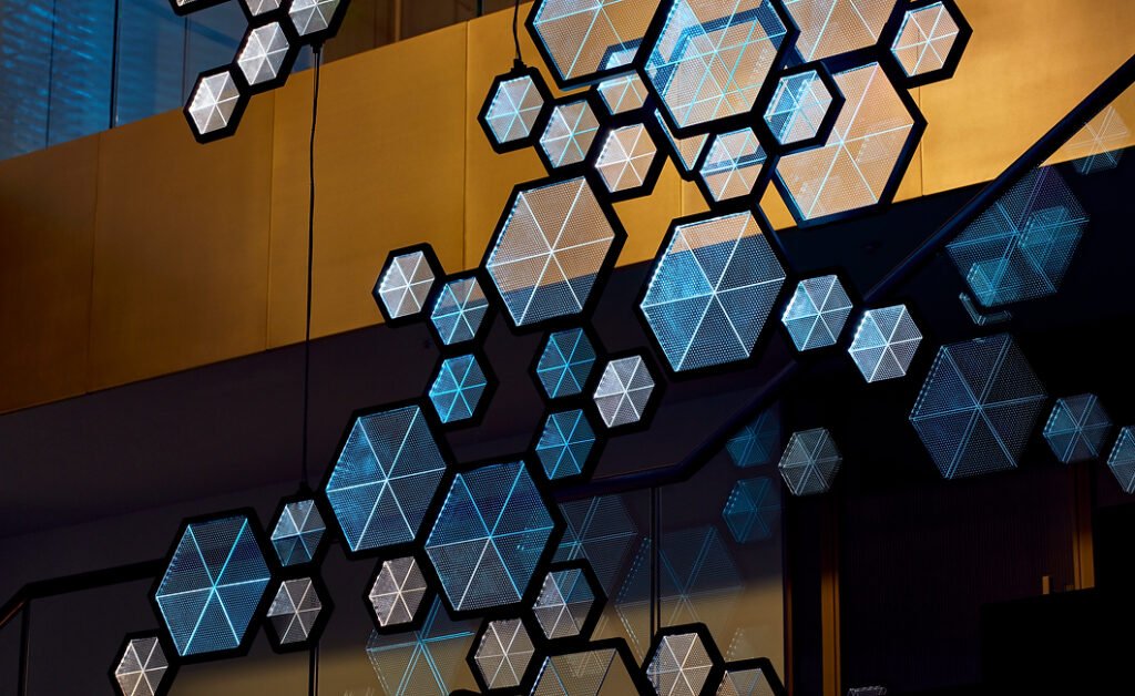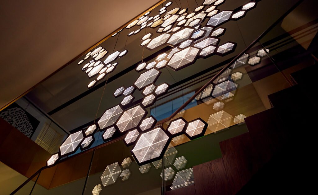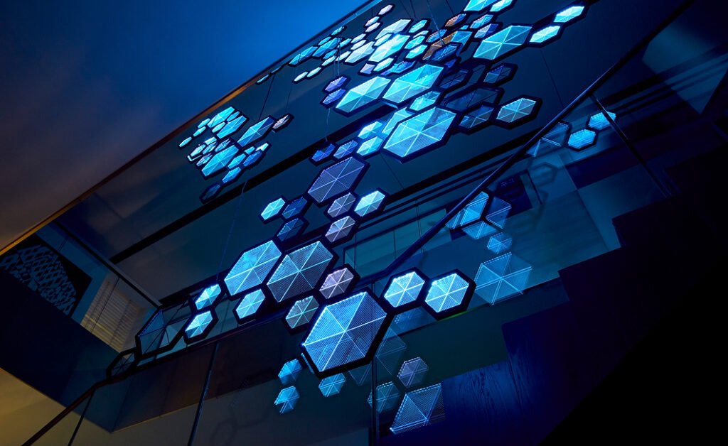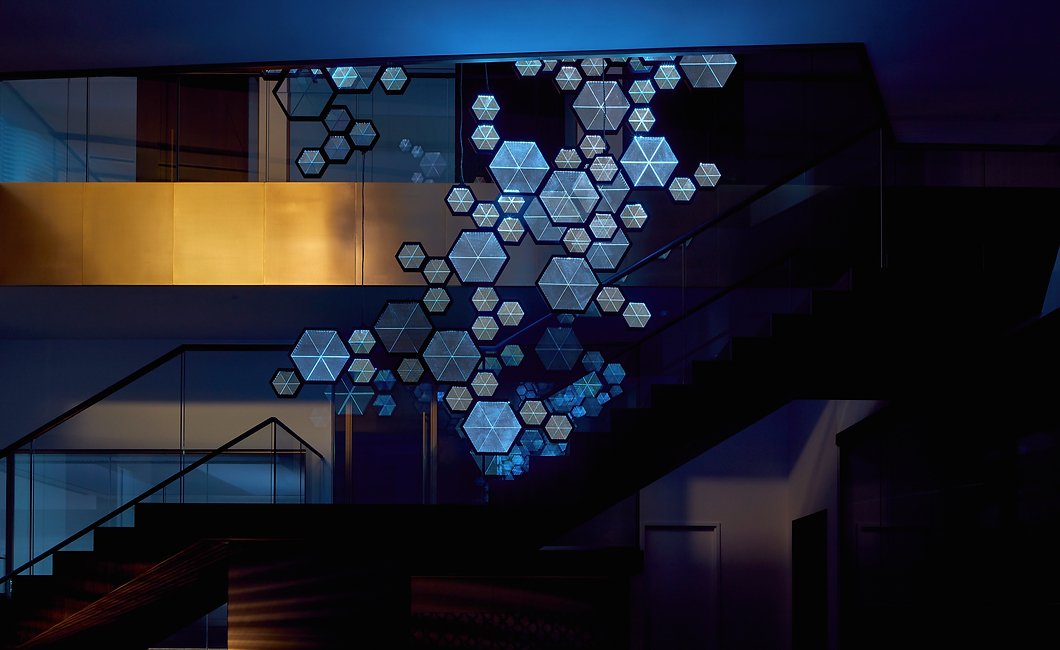 A custom software created for the project samples five thousand live financial transactions from the clients trading platform in real-time and abstracts it into a movement of light across the piece.